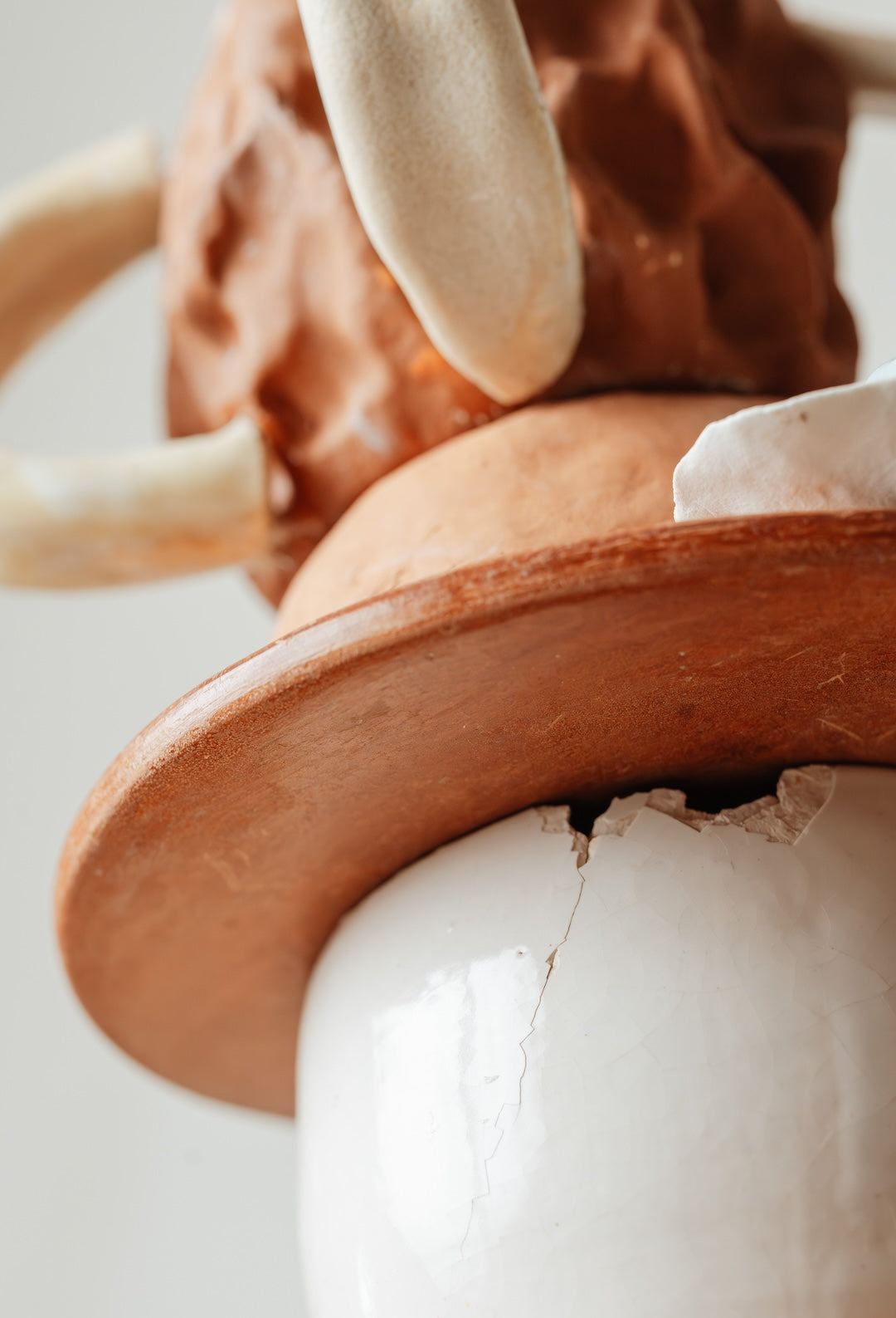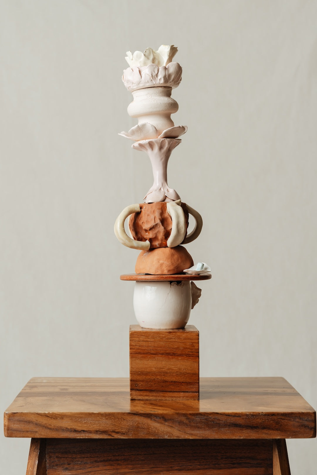 Construcción de objetos varios elaborados con pasta cerámica roja y blanca. Esmaltados y horneados en alta y baja temperatura. Base madera